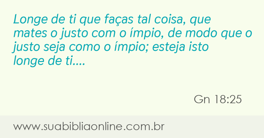 Faça sua busca na Bíblia. Sua Bíblia Online.Versão completa da Bíblia em Português com todos os livros, capítulos e versículos bíblicos.Longe de ti fazer tal coisa: matar o justo com o ímpio, tratando o justo e o ímpio da mesma maneira. Longe de ti! Não agirá com justiça o Juiz de toda a terra? "