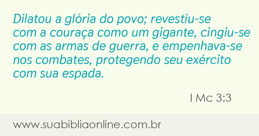 Faça sua busca na Bíblia. Sua Bíblia Online.Versão completa da Bíblia em Português com todos os livros, capítulos e versículos bíblicos.Dilatou a glória do povo; revestiu-se com a couraça como um gigante, cingiu-se com as armas de guerra, e empenhava-se nos combates, protegendo seu exército com sua espada.