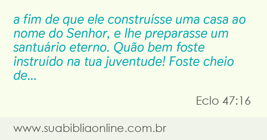 Faça sua busca na Bíblia. Sua Bíblia Online.Versão completa da Bíblia em Português com todos os livros, capítulos e versículos bíblicos.a fim de que ele construísse uma casa ao nome do Senhor, e lhe preparasse um santuário eterno. Quão bem foste instruído na tua juventude! Foste cheio de sabedoria como um rio. Tua alma cobriu toda a terra.