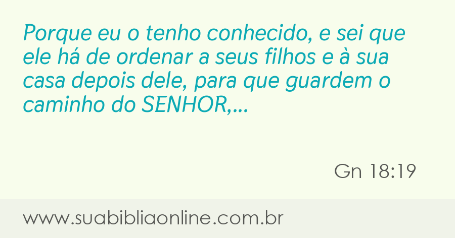 Faça sua busca na Bíblia. Sua Bíblia Online.Versão completa da Bíblia em Português com todos os livros, capítulos e versículos bíblicos.Porque o tenho conhecido, a fim de que ordene a seus filhos e a sua casa depois dele, que guardem o caminho de Jeová para praticarem a justiça e o juízo