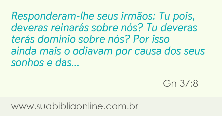 Faça sua busca na Bíblia. Sua Bíblia Online.Versão completa da Bíblia em Português com todos os livros, capítulos e versículos bíblicos.Responderam-lhe seus irmãos: Virás de fato a reinar sobre nós? ou virás de fato a ter domínio sobre nós? Aborreciam-no ainda mais por causa dos seus sonhos e por causa das suas palavras.