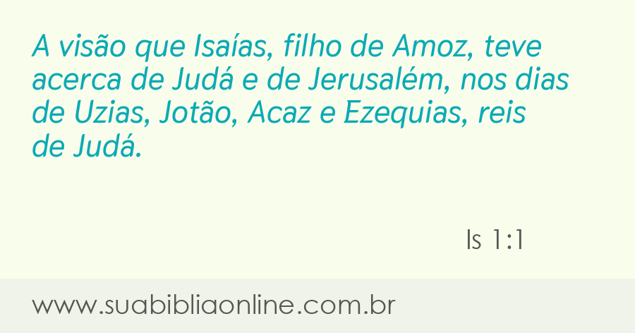 Faça sua busca na Bíblia. Sua Bíblia Online.Versão completa da Bíblia em Português com todos os livros, capítulos e versículos bíblicos.A visão que Isaías, filho de Amoz, teve acerca de Judá e de Jerusalém, nos dias de Uzias, Jotão, Acaz e Ezequias, reis de Judá.
