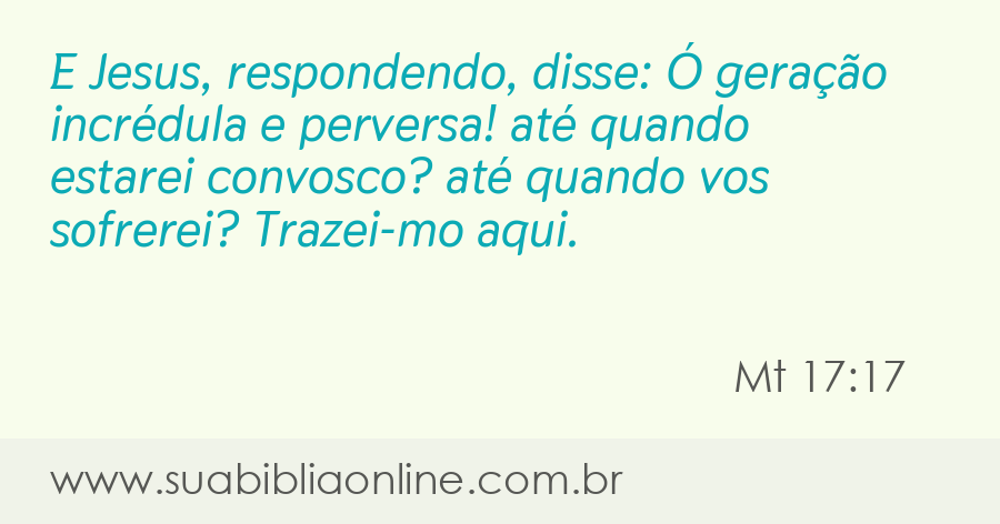 Faça sua busca na Bíblia. Sua Bíblia Online.Versão completa da Bíblia em Português com todos os livros, capítulos e versículos bíblicos.Jesus exclamou: Ó geração incrédula e perversa! até quando estarei convosco? até quando vos sofrerei? Trazei-me aqui o menino.