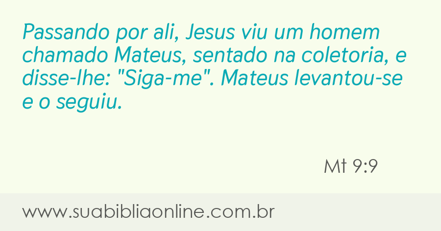 Faça sua busca na Bíblia. Sua Bíblia Online.Versão completa da Bíblia em Português com todos os livros, capítulos e versículos bíblicos.Jesus, partindo dali, viu um homem chamado Mateus, sentado na coletoria, e disse-lhe: Segue-me. Ele se levantou e o seguiu.