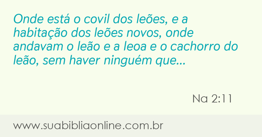 Faça sua busca na Bíblia. Sua Bíblia Online.Versão completa da Bíblia em Português com todos os livros, capítulos e versículos bíblicos.Onde está o covil dos leões, e a habitação dos leões novos, onde andavam o leão e a leoa e o cachorro do leão, sem haver ninguém que os espantasse?